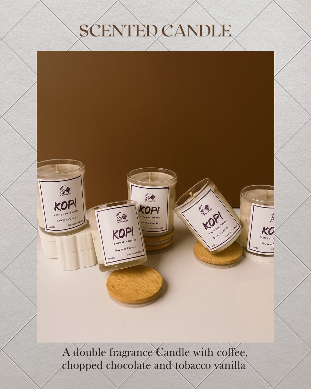 SCENTED CANDLES ARE HAND-POURED SOYWAX WITH GOOD FRAGRANCE OIL, CRAFTED TO ELEVATE THE ATMOSPHERE OF YOUR SPACE AND HOME.